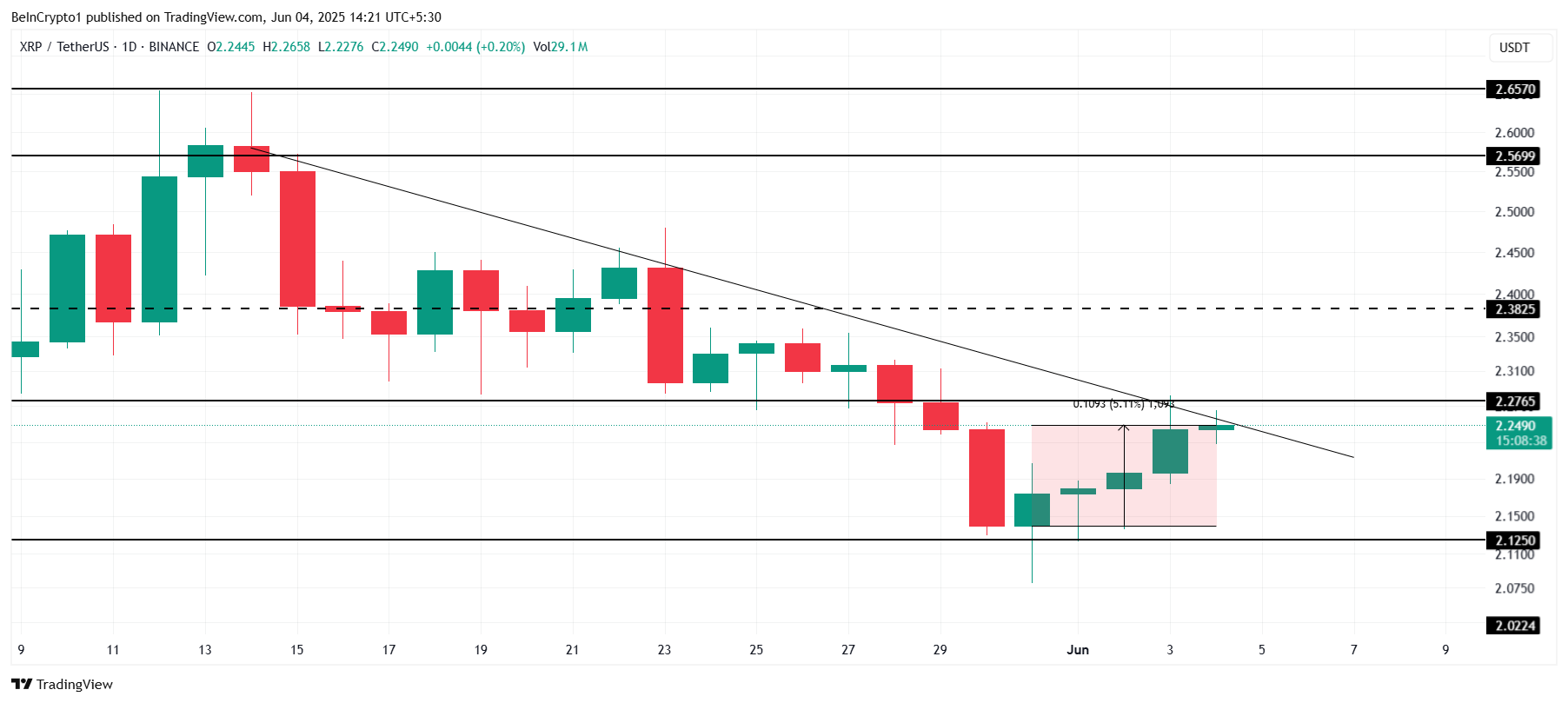 ราคาของ XRP อยู่ในแนวโน้มขาลงในช่วงสามสัปดาห์ที่ผ่านมา ซึ่งเป็นครั้งที่สามที่เกิดขึ้นเช่นนี้ altcoin เพิ่งเพิ่มขึ้น 5% ในช่วงห้าวันที่ผ่านมา โดยแตะที่ 2.24 USD แม้ว่าจะมีการเพิ่มขึ้นนี้ แต่ XRP ยังคงเผชิญกับแรงกดดันจากตลาดโดยรวมและแรงขายภายใน ซึ่งทำให้มีความเสี่ยงที่จะลดลงต่อไปหากไม่มีการสนับสนุนที่แข็งแกร่ง
