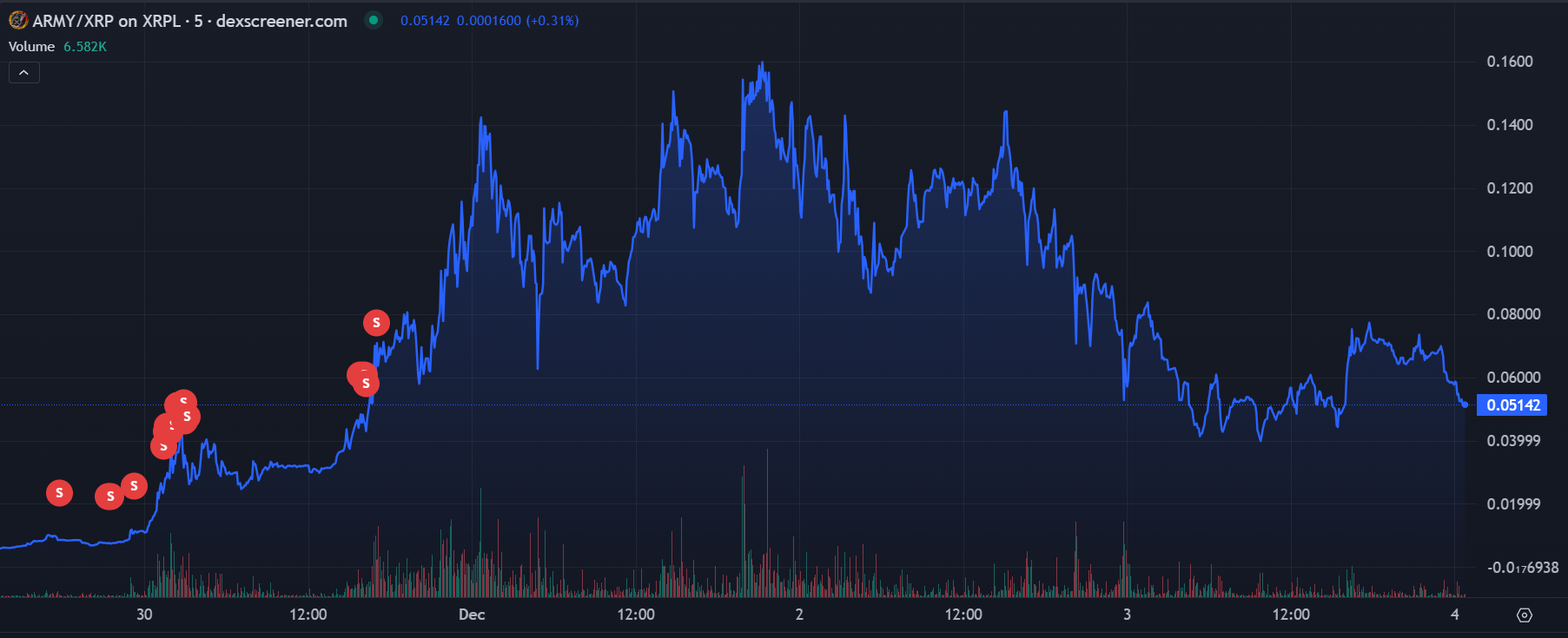 ARMY ซึ่งเป็นโทเค็นที่ได้รับแรงบันดาลใจจากชุมชน XRP ที่รู้จักกันในชื่อ XRP Army เพิ่มขึ้น 30% ในวันอังคารที่ 3 พฤศจิกายน ก่อนที่จะเผชิญกับการชำระบัญชี ตามข้อมูลจาก Dexscreener ข้อมูล มูลค่าตลาดของ ARMY เพิ่มขึ้นจากต่ำกว่า 1 ล้านดอลลาร์ ไปถึงจุดสูงสุดที่ 90 ล้านดอลลาร์ ภายในสัปดาห์เดียว อย่างไรก็ตาม มันได้ประสบกับการปรับฐานที่สำคัญ เนื่องจากนักลงทุนขายเพื่อรับกำไร