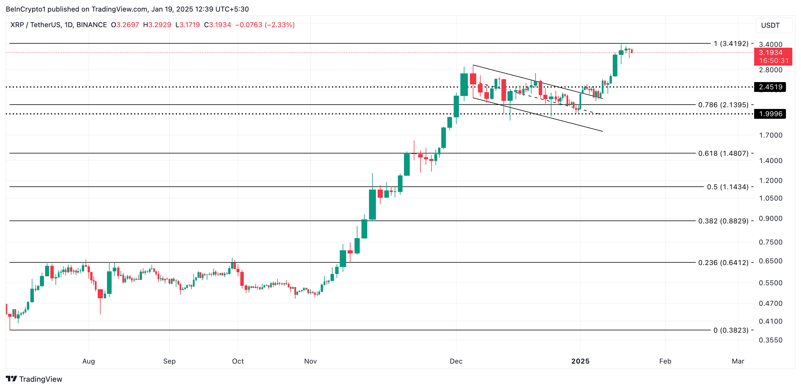 ณ เวลาที่รายงาน XRP ซื้อขายที่ 3.19 ดอลลาร์ หากการขายยังคงดำเนินต่อไป ราคาของ Token จะลดลงจากจุดสูงสุดตลอดกาลที่ 3.41 ดอลลาร์ ไปซื้อขายที่แนวรับที่ 2.45 ดอลลาร์