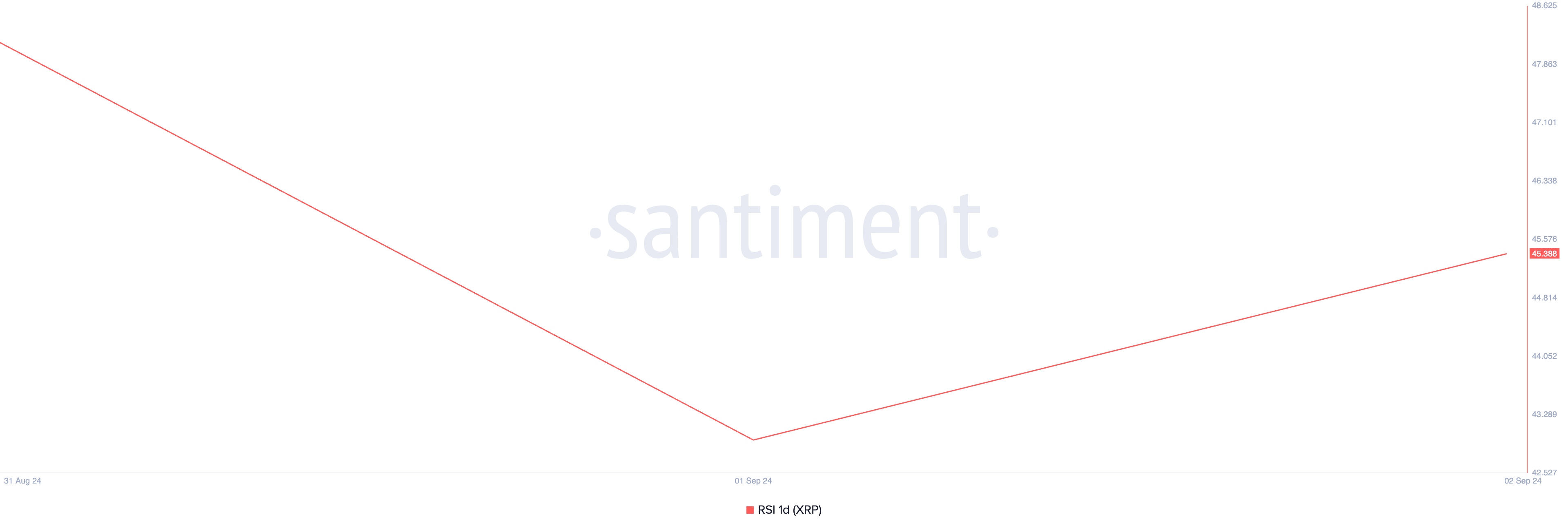 สนับสนุนสิ่งนี้ ดัชนีความแข็งแกร่งสัมพัทธ์ (RSI) ของ XRP อยู่ในแนวโน้มขาลงและปัจจุบันอยู่ต่ำกว่าเครื่องหมายกลาง 50 ที่ 45.23 สิ่งนี้บ่งชี้ว่าผู้เข้าร่วมตลาดเลือกที่จะขายมากกว่าซื้อ ซึ่งเพิ่มความรู้สึกขาลง