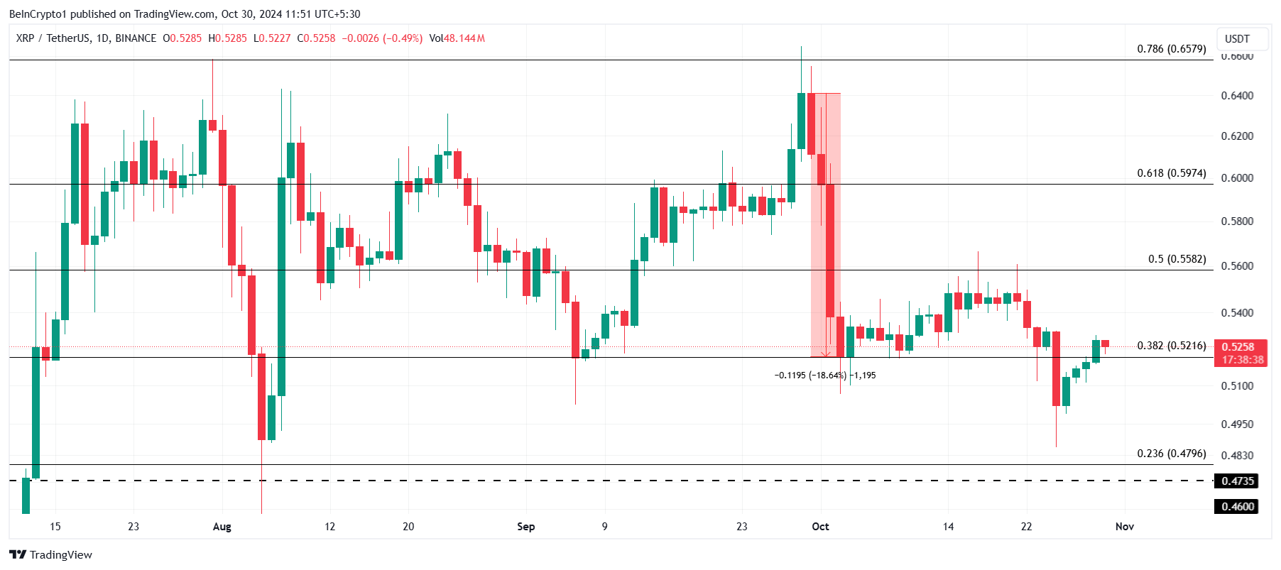 XRP ได้แสดงการฟื้นตัวเล็กน้อยในสัปดาห์ที่ผ่านมา โดยมีราคาอยู่ที่ 0.52 USD แม้ว่าจะยังคงรักษาระดับเหนือระดับการถอยหลังของ Fibonacci 38.2% ที่ราคานี้ การยืนยันราคา 0.52 USD เป็นฐานการสนับสนุนที่แข็งแกร่งเป็นสิ่งสำคัญสำหรับ XRP เพื่อดำเนินการฟื้นตัวต่อไป หากไม่มีความมั่นคงที่ระดับนี้ การฟื้นตัวอาจยากที่จะรักษาไว้ได้