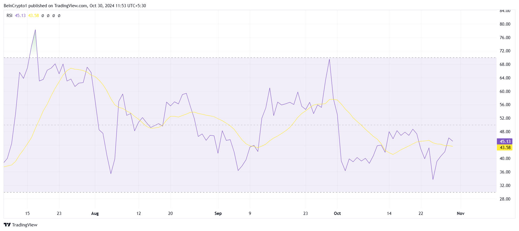 แรงกระเพื่อมระดับมหภาคของ XRP สะท้อนถึงการเปลี่ยนแปลงความรู้สึกนี้ ตามที่เห็นได้จากตัวชี้วัดทางเทคนิคเช่นดัชนีความแข็งแกร่งสัมพัทธ์ (RSI) ซึ่งปัจจุบันอยู่ต่ำกว่าเส้นกลาง 50.0 บ่งชี้ถึงการขาดแรงกระเพื่อมเชิงบวก