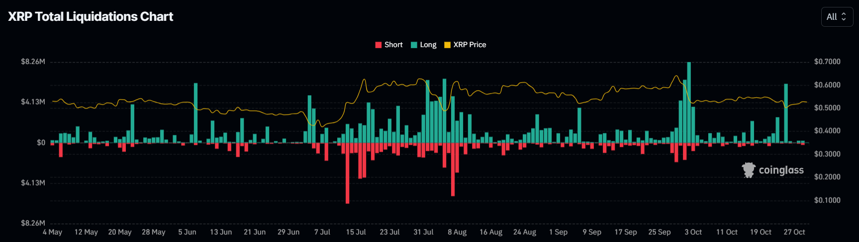 ความรู้สึกต่อ XRP ในปัจจุบันได้รับผลกระทบ จากปริมาณการชำระบัญชีที่สูง ซึ่งมีการครอบงำโดยผู้ถือสัญญายาว การชำระบัญชีเหล่านี้สะท้อนถึงความไม่แน่นอนของนักเทรดที่เคยคาดหวังว่าราคาจะเพิ่มขึ้น อย่างไรก็ตาม การขาดการเติบโตของ XRP และการลดลงของราคาอย่างรุนแรงเป็นครั้งคราวได้นำไปสู่การชำระบัญชียาวอย่างต่อเนื่อง โดยนักลงทุนลดการถือครองของพวกเขาลง แนวโน้มนี้เพิ่มแรงกดดันลงสู่ XRP และบ่งชี้ว่าความมั่นใจของนักลงทุนอาจกำลังลดลง