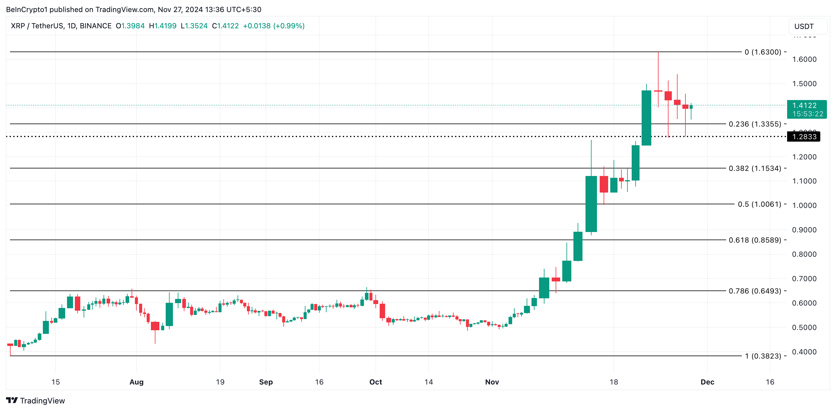 XRP ได้เห็นการเพิ่มขึ้นของกิจกรรมการขายตั้งแต่ที่มันขึ้นไปถึงจุดสูงสุดในรอบสามปีที่ 1.63 USD เมื่อวันที่ 23 พฤศจิกายน ปัจจุบันซื้อขายที่ 1.41 USD, altcoin นี้ได้ลดลง 13% จากราคาสูงสุด