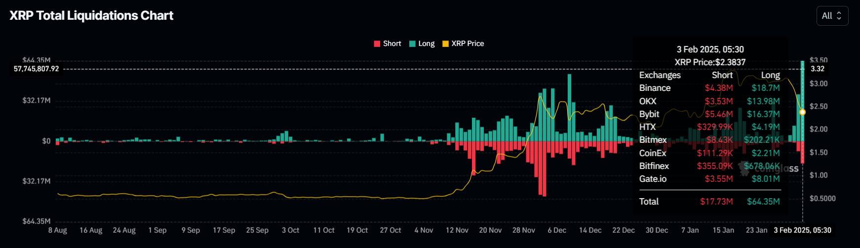ผู้ค้า XRP ต้องเผชิญกับการชำระบัญชีที่ใหญ่ที่สุดในรอบหกเดือนเมื่อราคาของ altcoin ลดลงต่ำกว่า 2 USD ในวันเดียว การชำระบัญชีระยะยาวพุ่งขึ้นถึง 64 ล้าน USD แสดงถึงการออกจากตลาดอย่างรวดเร็วของผู้ค้า การเพิ่มขึ้นของการชำระบัญชีนี้สะท้อนถึงความกลัวและความไม่แน่นอนที่เพิ่มขึ้นในตลาด