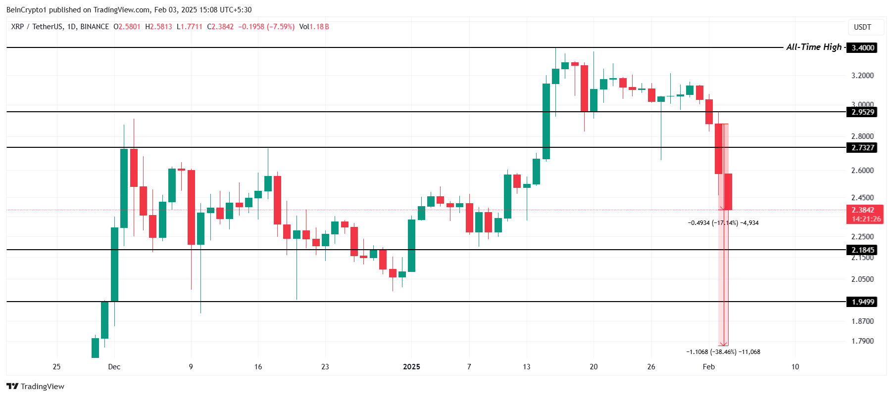 XRP ลดลง 17% ในช่วง 24 ชั่วโมงที่ผ่านมา โดยซื้อขายที่ 2.38 USD ความเสียหายที่ใหญ่ที่สุดเกิดขึ้นในช่วงราคาต่ำสุดระหว่างวันเมื่อราคาลดลง 38% ไปถึง 1.77 USD การลดลงอย่างรวดเร็วนี้บ่งบอกถึงความผันผวนของตลาดอย่างมาก โดยนักลงทุนยังไม่แน่ใจเกี่ยวกับอนาคตระยะสั้นของ coin นี้