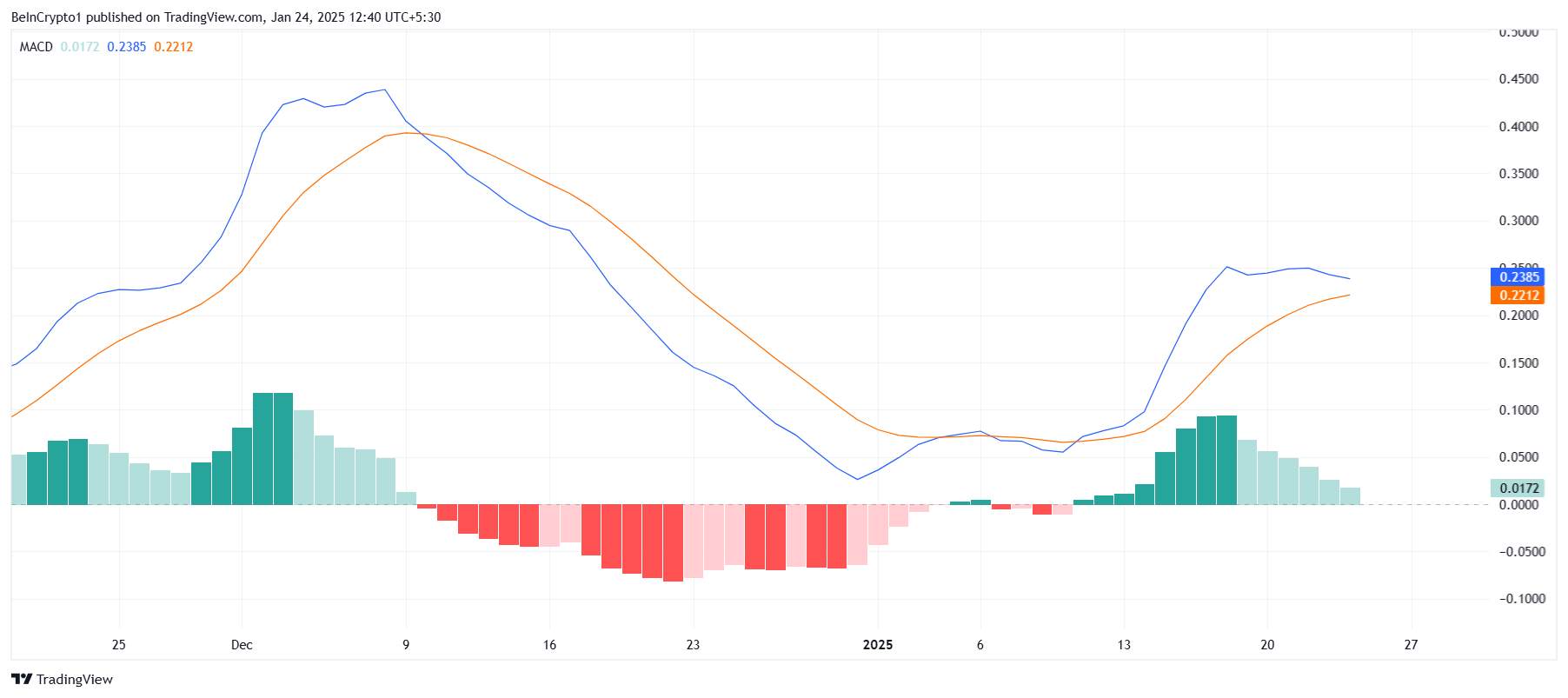 โมเมนตัมมหภาคของ XRP กำลังส่งสัญญาณความเสี่ยงขาลงเพิ่มเติม การบรรจบกันและการแยกกันของค่าเฉลี่ยเคลื่อนที่ (MACD) กำลังจะเกิดการครอสโอเวอร์ขาลง ตัวบ่งชี้ทางเทคนิคนี้แสดงให้เห็นว่าโมเมนตัมการขายกำลังแซงหน้าความกดดันในการซื้อ ทำให้เกิดความกังวลในหมู่ผู้ค้า