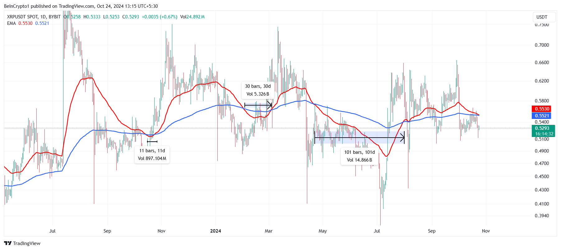 นอกจากนี้ XRP ยังพบกับแรงต้านที่ 0.55 USD ซึ่งตรงกับเส้น Fibonacci 50% การรวมกันของระดับสนับสนุนและแรงต้านนี้ได้สร้างช่วงการรวมตัวสำหรับ XRP ด้วยสภาพทางเทคนิคและตลาดที่ยังคงดำเนินอยู่ การรวมตัวนี้คาดว่าจะยังคงอยู่ในช่วงวันข้างหน้า โดย XRP ไม่น่าจะหลุดออกจากช่วงนี้ได้โดยไม่มีปัจจัยภายนอกที่สำคัญ