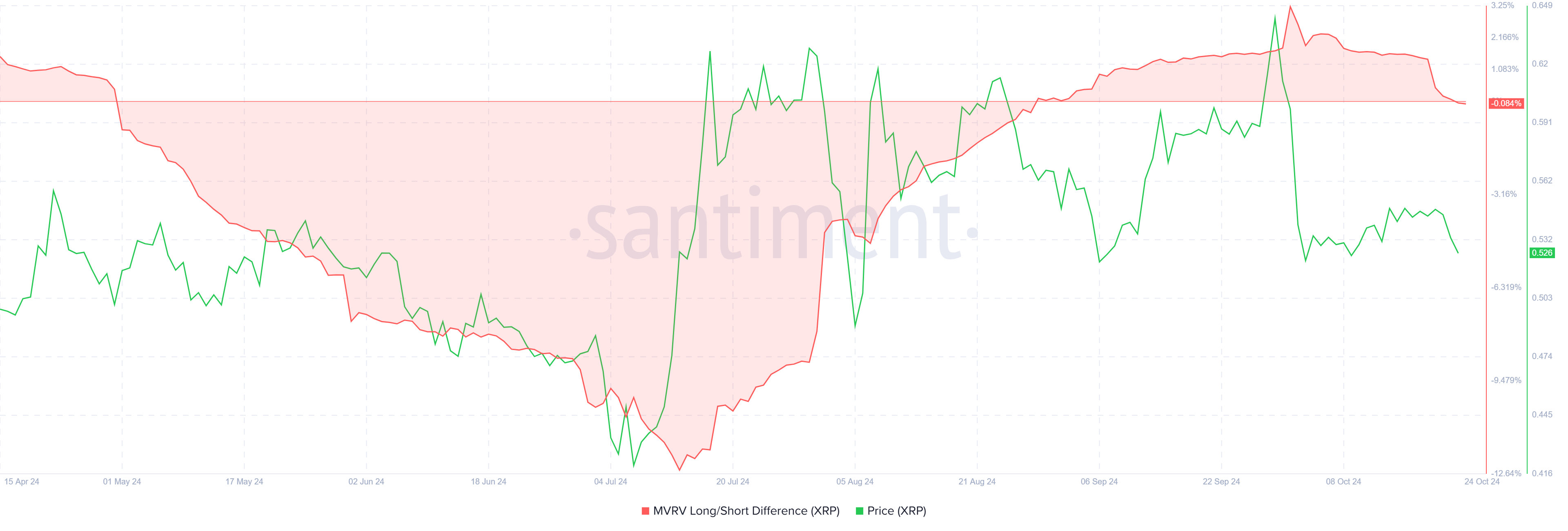 ค่าต่างระหว่าง MVRV ระยะยาว/ระยะสั้นสำหรับ XRP ได้ลดลงเป็นลบหลังจากมีการปรับตัวในสามวันที่ผ่านมา หาก MVRV เป็นบวก หมายความว่าผู้ถือระยะยาว (LTHs) มีกำไร ในขณะที่ค่าลบบ่งชี้ว่าผู้ถือระยะสั้น (STHs) มีกำไรมากกว่า ในปัจจุบัน ด้วย MVRV ที่ -0.08% ทั้ง LTHs และ STHs มีสภาพคล่องเท่ากัน สะท้อนถึงตลาดที่อ่อนแอ