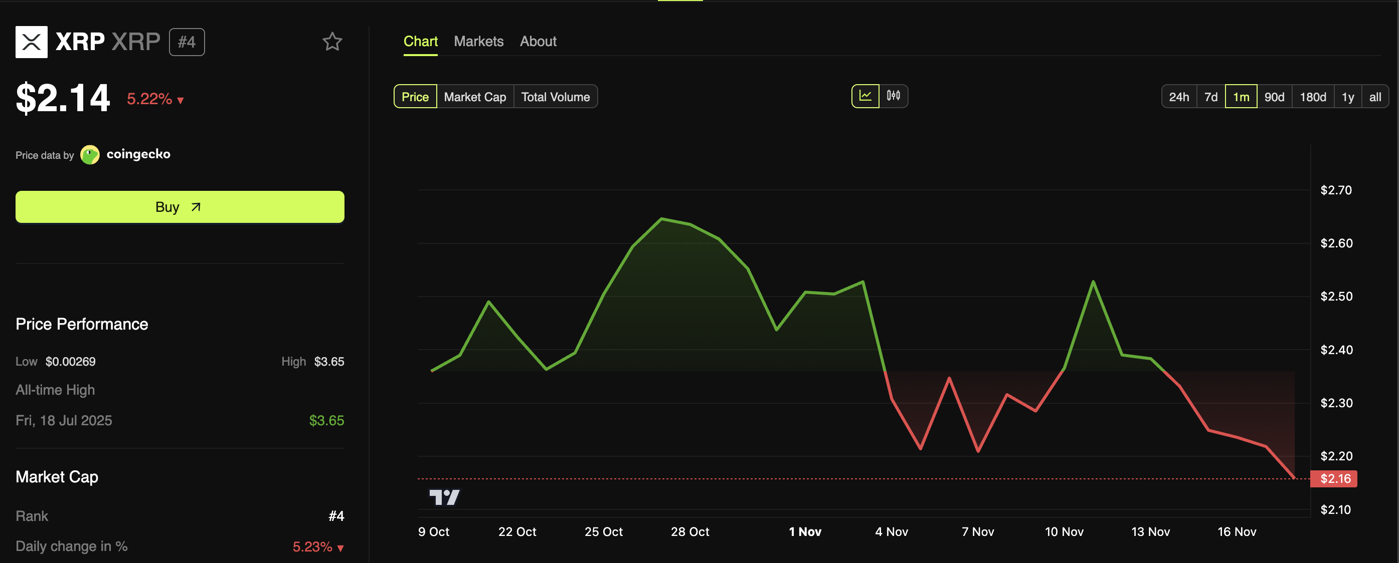 แม้จะมีการไหลเข้าที่สูง ราคาของ XRP ได้ลดลงประมาณ 11% ตั้งแต่วันที่ 13 พฤศจิกายน ข้อมูลจาก BeInCrypto Markets เผยว่าขณะกดรายงาน เหรียญ altcoin นี้ซื้อขายอยู่ที่ USD 2.14 ลดลง 5.22% ในวันเดียวกัน