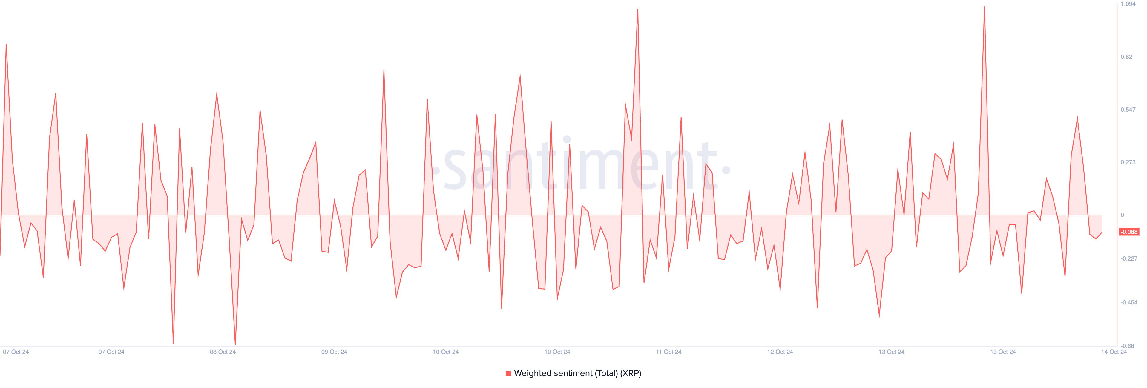 ความรู้สึกเชิงลบที่เน้นน้ำหนักของ XRP เป็นตัวบ่งชี้ชัดเจนของอคติเชิงลบที่ตามมาในช่วงไม่กี่วันที่ผ่านมา ตัวชี้วัดนี้ ซึ่งวัดอารมณ์ตลาดโดยรวมต่อสินทรัพย์ ปัจจุบันอยู่ที่ -0.08