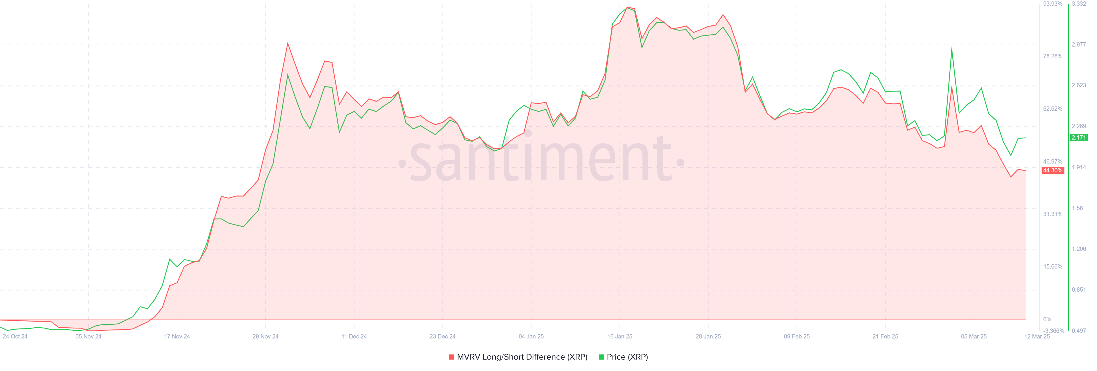 แรงผลักดันในระดับมหภาคของ XRP ก็ได้รับผลกระทบจากสภาวะตลาดที่กว้างขึ้น แม้ว่าผู้ถือระยะยาว (LTHs) ยังคงเป็นแรงสนับสนุนที่สำคัญในการรักษาราคา ความแตกต่างระหว่าง MVRV ระยะยาว/ระยะสั้นแสดงให้เห็นว่า LTHs กำลังนั่งอยู่บนกำไรที่มากในขณะนี้ นักลงทุนเหล่านี้ยังคงถือครองตำแหน่งของตนแทนที่จะขายในราคาต่ำ ซึ่งให้การสนับสนุน XRP และป้องกันการลดลงของราคาเพิ่มเติม