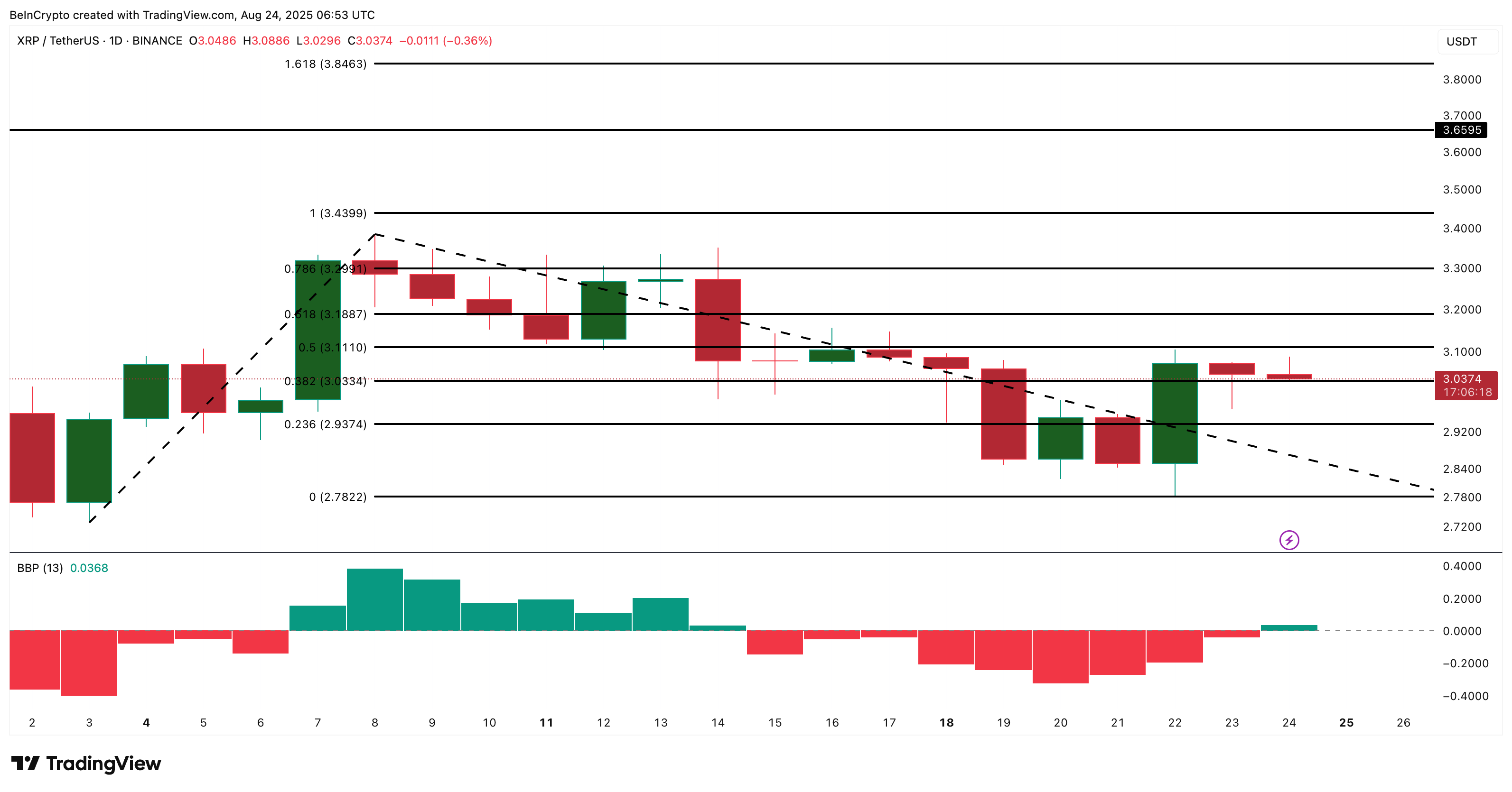 ในช่วงต้นเดือนสิงหาคม หลังจากที่ bulls ควบคุมโมเมนตัมได้ชั่วคราว XRP กระโดดจาก USD 2.90 ไปยัง USD 3.33 ในเวลาไม่กี่เซสชัน การตอบสนองที่คล้ายกันอาจตามมา ผลักดันราคา XRP ใกล้กับอุปสรรค USD 3.29