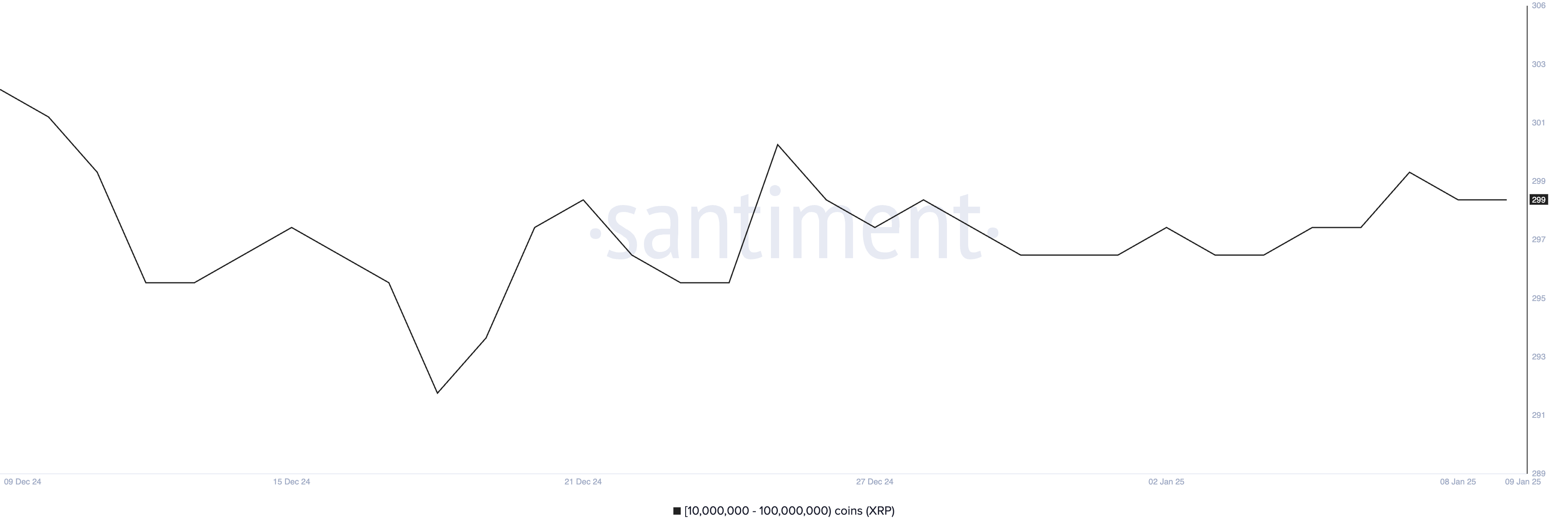 ที่อยู่ของวาฬที่ถือระหว่าง 10 ล้านถึง 100 ล้าน XRP เพิ่มขึ้นเล็กน้อยถึง 299 ณ วันที่ 8 มกราคม บ่งบอกถึงการสะสมอย่างระมัดระวัง อย่างไรก็ตาม หากไม่มีแรงซื้อที่แข็งแกร่งขึ้นหรือความเชื่อมั่นของตลาดที่ดีขึ้น XRP ยังคงเสี่ยงต่อการปรับฐานเพิ่มเติมหรือการรวมตัวที่ยาวนานขึ้น
