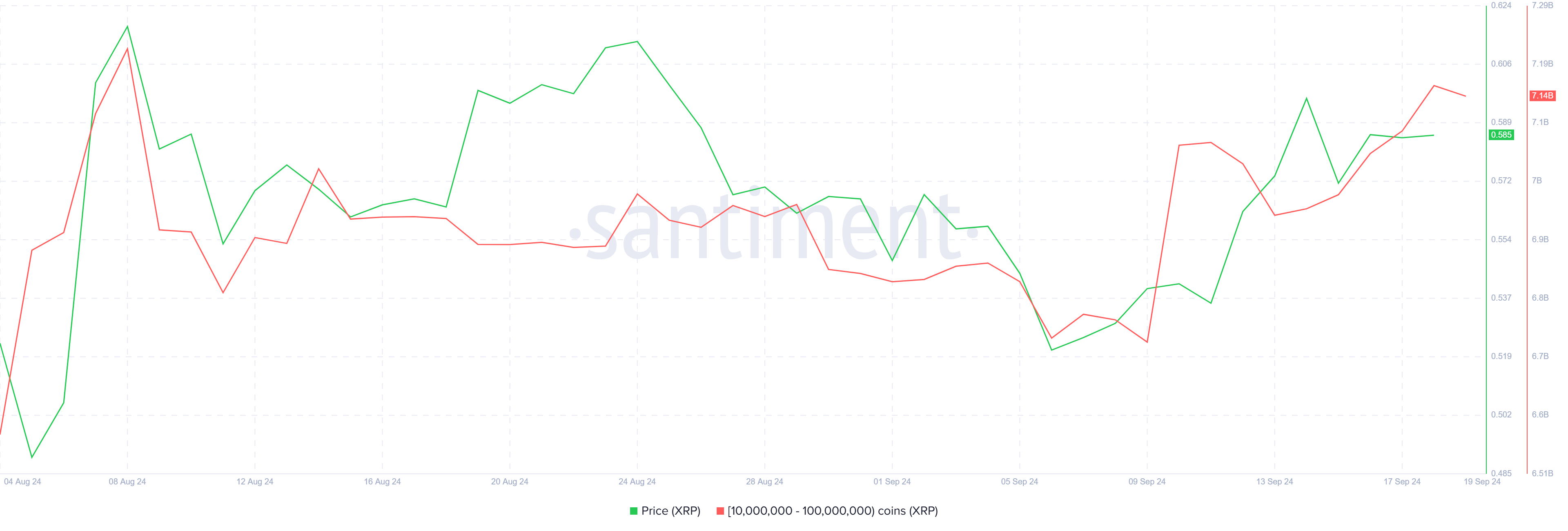 กิจกรรมของวาฬได้เพิ่มขึ้นในช่วงไม่กี่วันที่ผ่านมา โดยผู้ถือจำนวนมากได้เพิ่มสถานะของพวกเขาอย่างมาก โดยเฉพาะอย่างยิ่ง ที่อยู่ที่ถือระหว่าง 10 ล้านถึง 100 ล้านโทเค็น XRP ได้ร่วมกันซื้อ XRP 200 ล้านโทเค็น มีมูลค่ามากกว่า 116 ล้าน USD การสะสมนี้ชี้ไปที่ความเชื่อที่เพิ่มขึ้นในศักยภาพขาขึ้นของสินทรัพย์