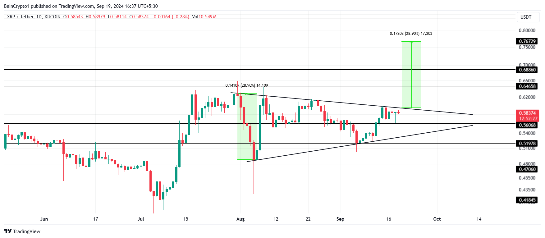 XRP กำลังเคลื่อนไหวภายในรูปแบบสามเหลี่ยมขาขึ้น ซึ่งเป็นรูปแบบที่มีแนวโน้มบวกและคาดการณ์ว่าจะเพิ่มขึ้น 28.9% เมื่อสามารถทะลุออกไปได้สำเร็จ หากเกิดขึ้น XRP อาจพุ่งสูงถึง 0.76 USD ซึ่งจะให้ผลตอบแทนที่ดีแก่นักลงทุน