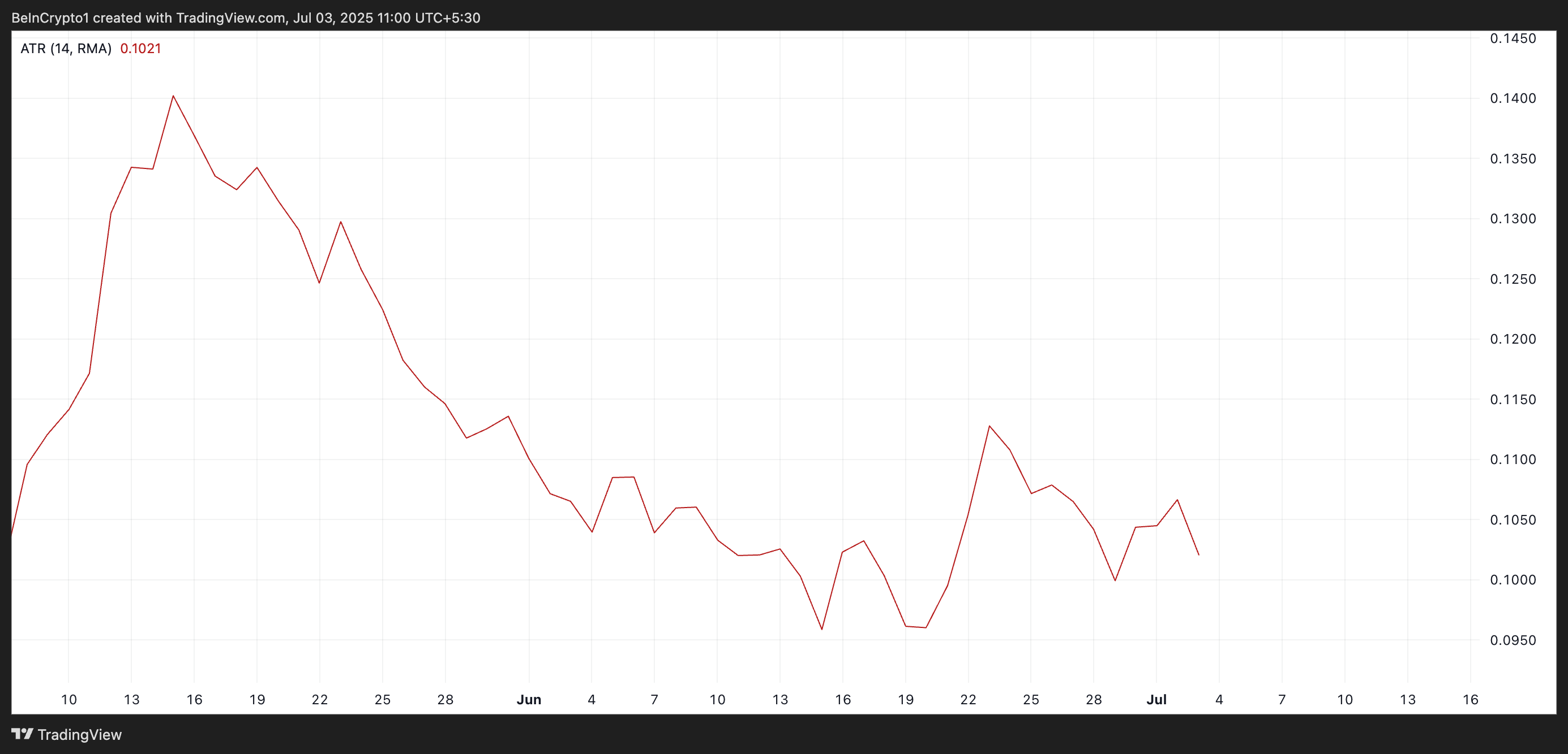 ตัวชี้วัด ATR วัดระดับการเคลื่อนไหวของราคาในช่วงเวลาที่กำหนด เมื่อมันมีแนวโน้มลดลงเช่นนี้ มักบ่งบอกว่าความผันผวนของราคากำลังแคบลงและแรงผลักดันกำลังอ่อนแอลง