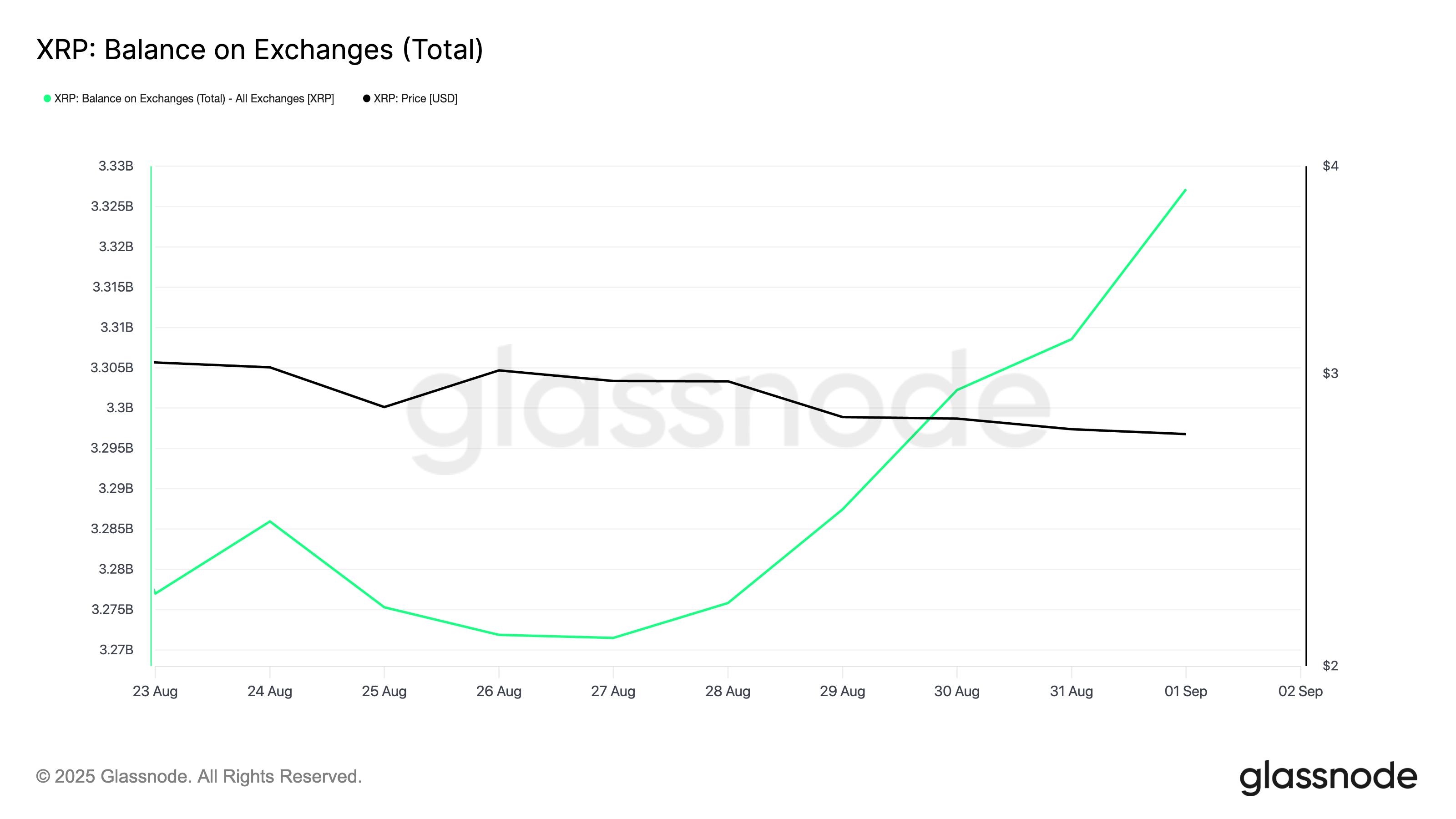 บนเครือข่าย ยอดคงเหลือของ XRP ที่เพิ่มขึ้นในตลาดแลกเปลี่ยนยืนยันการกระจายที่เพิ่มขึ้นในหมู่ผู้เข้าร่วมตลาด ตามข้อมูลจาก Glassnode ยอดสำรองของ XRP ในตลาดแลกเปลี่ยน เพิ่มขึ้น 2% ตั้งแต่วันที่ 27 สิงหาคม บ่งชี้ถึงการทำกำไรที่เพิ่มขึ้นในหมู่ผู้ถือโทเค็น