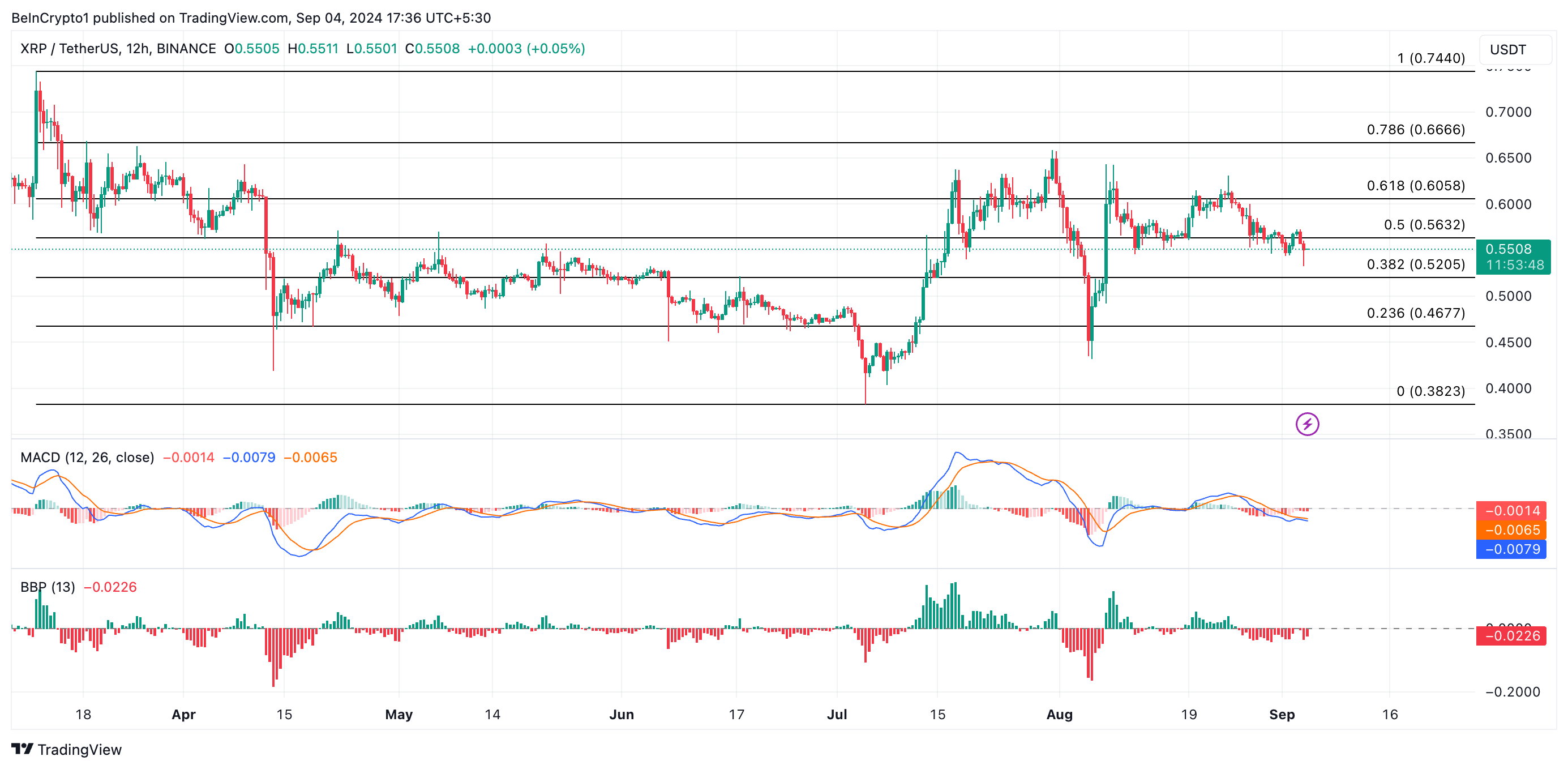 ณ เวลานี้ XRP มีราคาอยู่ที่ USD0.55 และกราฟ 12 ชั่วโมงแสดงถึงแนวโน้มที่จะลดลงต่อไป สาย MACD ของโทเค็น (สีน้ำเงิน) อยู่ต่ำกว่าสายสัญญาณ (สีส้ม) และเส้นศูนย์ ซึ่งบ่งบอกถึงแนวโน้มที่แข็งแกร่งในทางลบ การตั้งค่านี้ส่งสัญญาณถึงแนวโน้มที่จะลดลงต่อเนื่อง หากไม่มีการกลับตัว ทำให้ผู้ค้าควรหลีกเลี่ยงตลาดหรือพิจารณาตำแหน่งขายทิ้ง