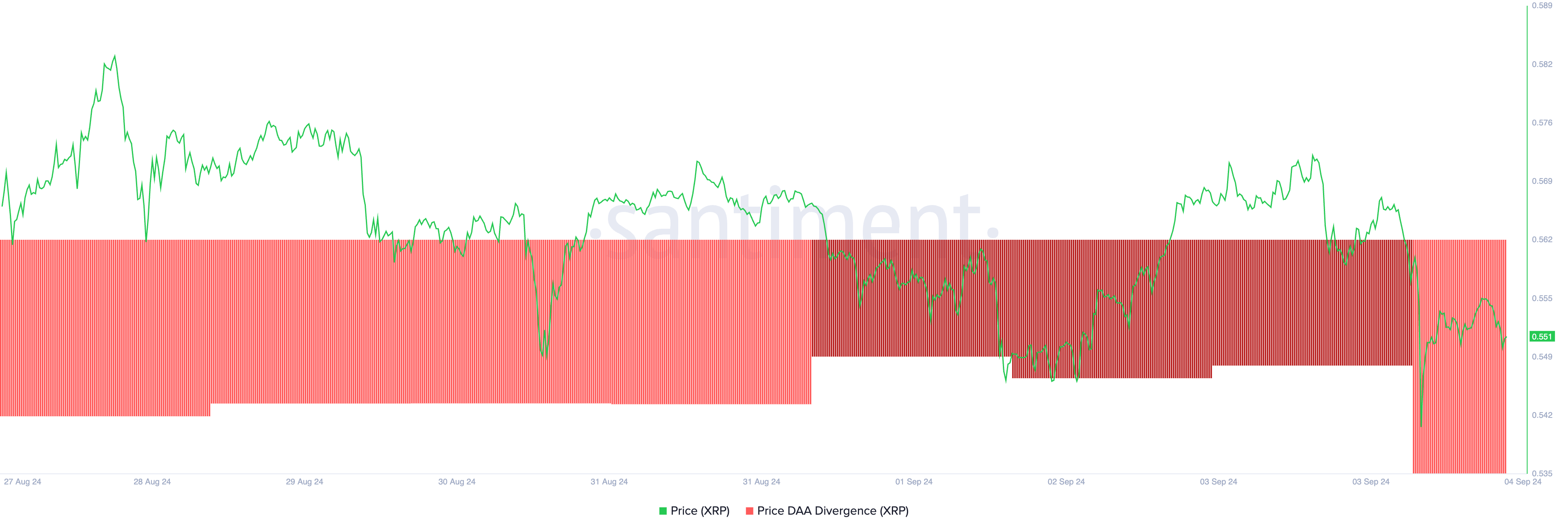 ความเบี่ยงเบนระหว่างราคากับจำนวนที่อยู่ใช้งานรายวันของ XRP ยืนยันเพิ่มเติมถึงการเพิ่มขึ้นของกิจกรรมการขาย ตัวชี้วัดนี้ติดตามการเคลื่อนไหวของราคาสินทรัพย์และเปรียบเทียบกับการเปลี่ยนแปลงในจำนวนที่อยู่ใช้งานรายวัน
