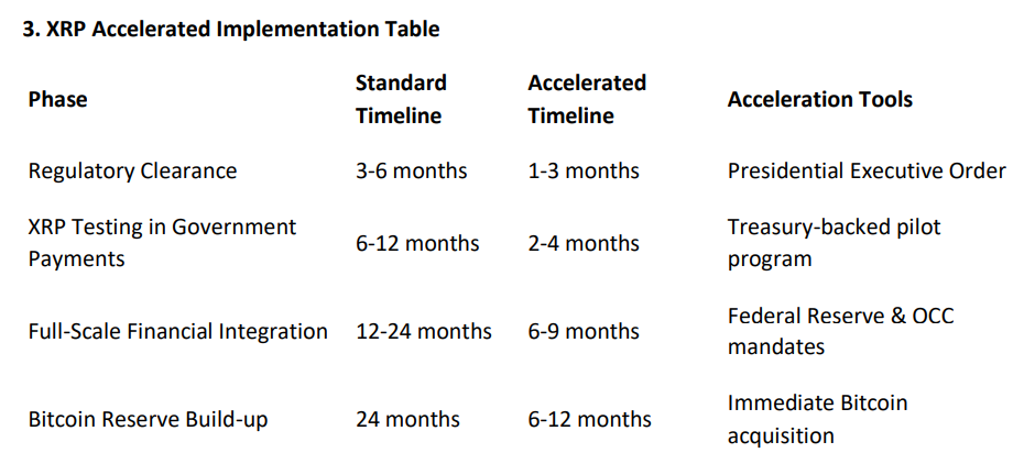 แผนหลังจะต้องการการอนุมัติทางกฎหมายทันที การทดลองใช้ XRP ของรัฐบาลที่เร่งรัด และคำสั่งให้ธนาคารรวม XRP เป็นเครื่องมือสภาพคล่อง