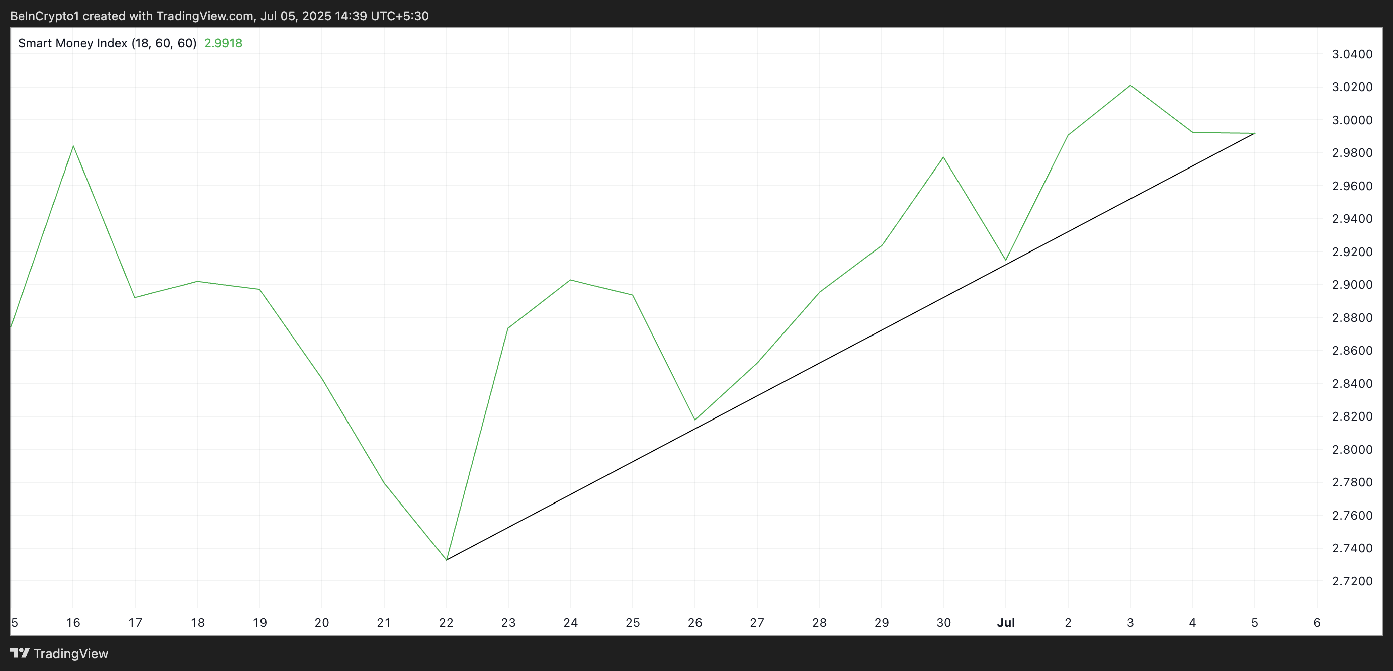 ตั้งแต่ปลายเดือนมิถุนายน การเพิ่มขึ้นอย่างต่อเนื่องในดัชนี Smart Money Index (SMI) ของ XRP บ่งชี้ว่า ‘smart money’ กำลังกลับเข้าสู่ตลาดและกำลังวางตำแหน่งสำหรับ โอกาสขาขึ้น การอ่านค่าจากตัวบ่งชี้นี้แสดงให้เห็นว่ามูลค่าได้เพิ่มขึ้น 10% ตั้งแต่วันที่ 22 มิถุนายน