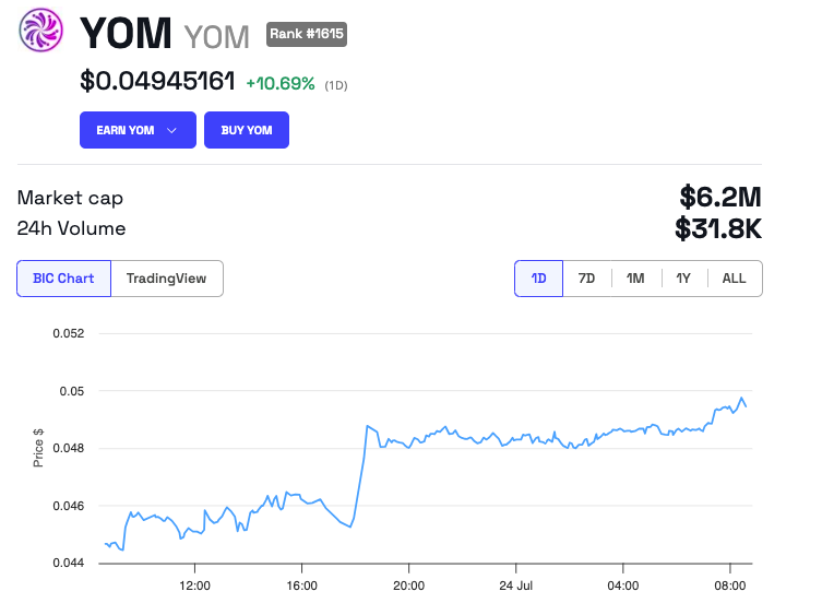 ในแง่ของการเงิน ราคาโทเค็นของ YOM เพิ่มขึ้น 10.69% ในช่วง 24 ชั่วโมงที่ผ่านมา โดยขณะนี้มีมูลค่าอยู่ที่ 0.049 ดอลลาร์ อย่างไรก็ตาม มูลค่าหลักทรัพย์ตามราคาตลาดของโทเค็นอยู่ที่ประมาณ 6 ล้านดอลลาร์ ด้วยเหตุนี้ YOM จึงเหมือนกับ altcoins ที่มีมูลค่าต่ําอื่นๆ อาจมีความผันผวนของตลาดอย่างมีนัยสําคัญ ซึ่งจําเป็นต้องมีความระมัดระวังของนักลงทุน