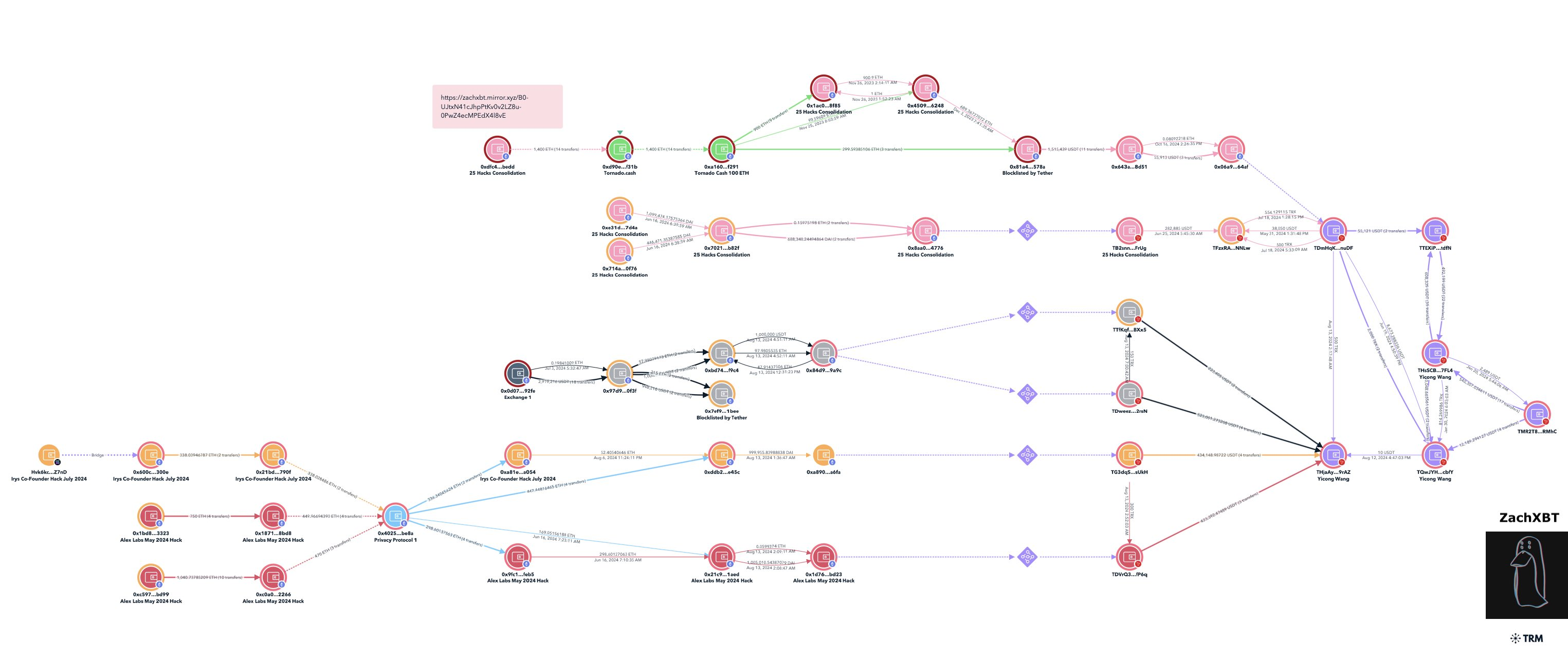ZachXBT ไม่ได้ระบุจำนวนทรัพย์สินที่ถูกขโมยที่ Yicong ช่วยให้กลุ่ม Lazarus ฟอกเงิน อย่างไรก็ตาม เขาได้ชี้ให้เห็นเหตุการณ์หลายครั้งที่มีมูลค่าหลายล้านดอลลาร์ และอ้างว่า Yicong ช่วย “แปลงเงินคริปโตที่ถูกขโมยหลายสิบล้านเป็นเงินสด” ตั้งแต่ปี 2022 นอกจากนี้ ในกระทู้อื่น ZachXBT ได้กล่าวถึงความยากในการติดตามเงินเหล่านี้อย่างชัดเจน