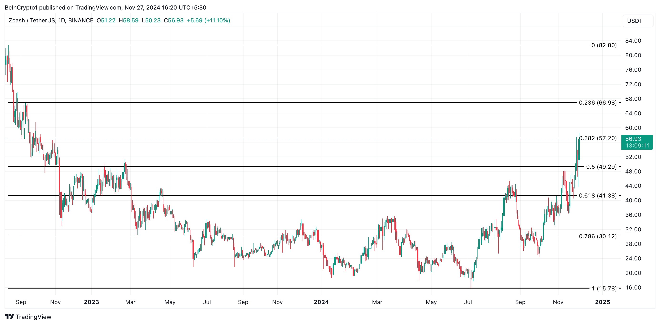ณ เวลานี้ ZEC ซื้อขายที่ 56.93 USD ซึ่งเป็นราคาที่เคยแตะครั้งสุดท้ายในเดือนตุลาคม 2022 การพุ่งขึ้นนี้มาพร้อมกับการเพิ่มขึ้นอย่างมากในกิจกรรมการซื้อขาย โดยมีปริมาณถึง 175 ล้าน USD ในช่วง 24 ชั่วโมงที่ผ่านมา ซึ่งเพิ่มขึ้น 68%