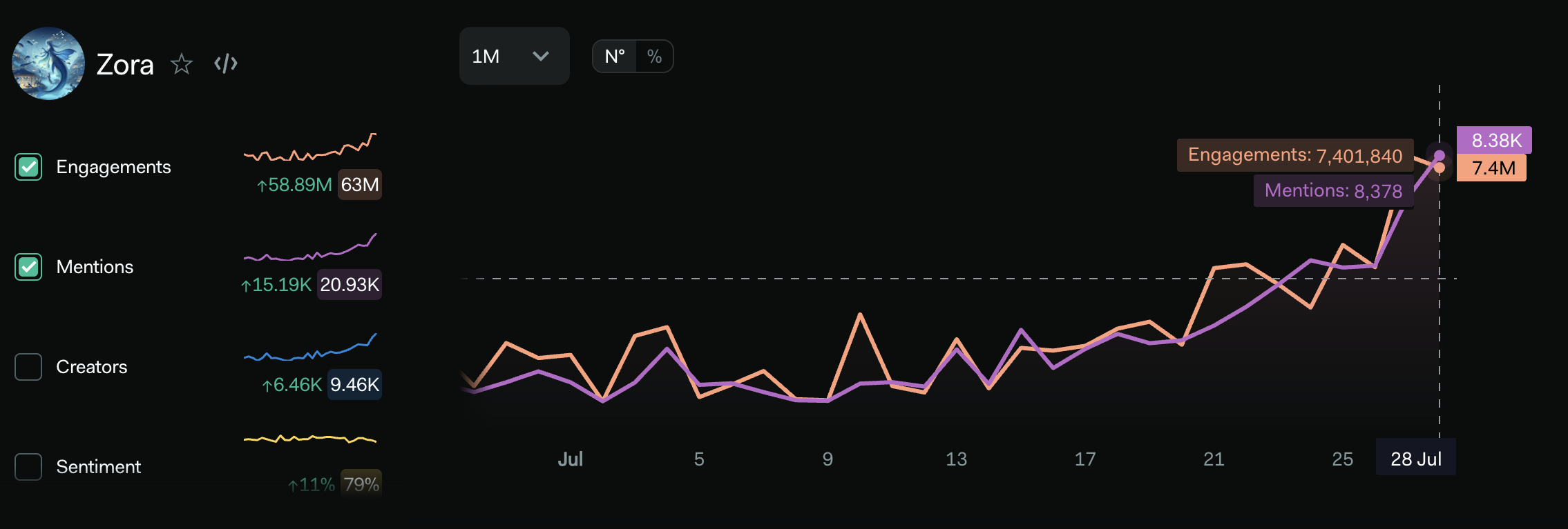 ไม่ใช่แค่ราคาที่พุ่งขึ้นเท่านั้น ตามข้อมูลจาก LunarCrush การกล่าวถึง ZORA เพิ่มขึ้นจาก 2,893 เป็น 8,378 ซึ่งเพิ่มขึ้นประมาณ 189.6% ในสัปดาห์ที่ผ่านมา นอกจากนี้ การมีส่วนร่วมก็เพิ่มขึ้นจาก 4.2 ล้านเป็น 7.4 ล้าน